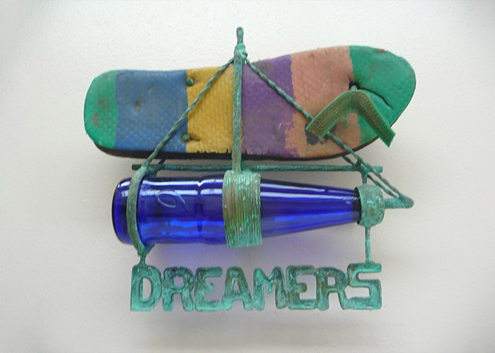 Dans cette série « Exil et Bouteilles à la mer », on y retrouve un rélfexion forte sur la société actuelle, un réel engagement. Mais toujours mêlée de poésie et d’humour. Le geste du sculpteur congédie l’objet, faisant place à la puissante liberté de la matière et des émotions qui la traversent. Rappelons qu’en matière politique ou en matière d’Art « Au pays du rêve personne n’est interdit de séjour ».